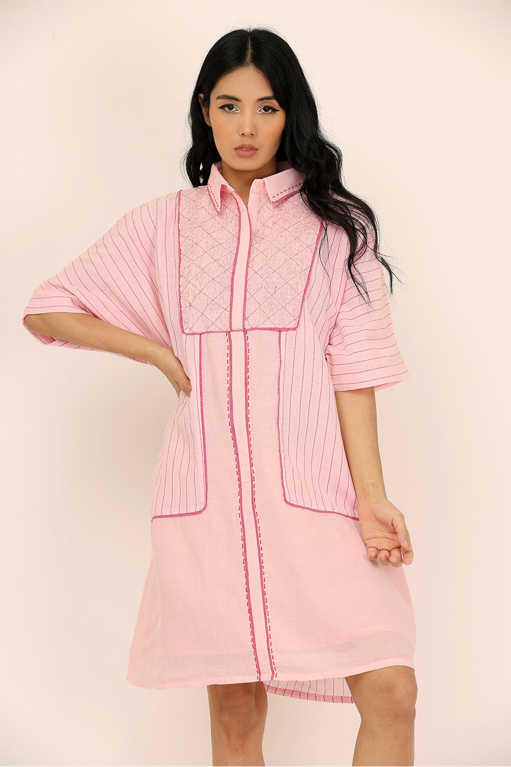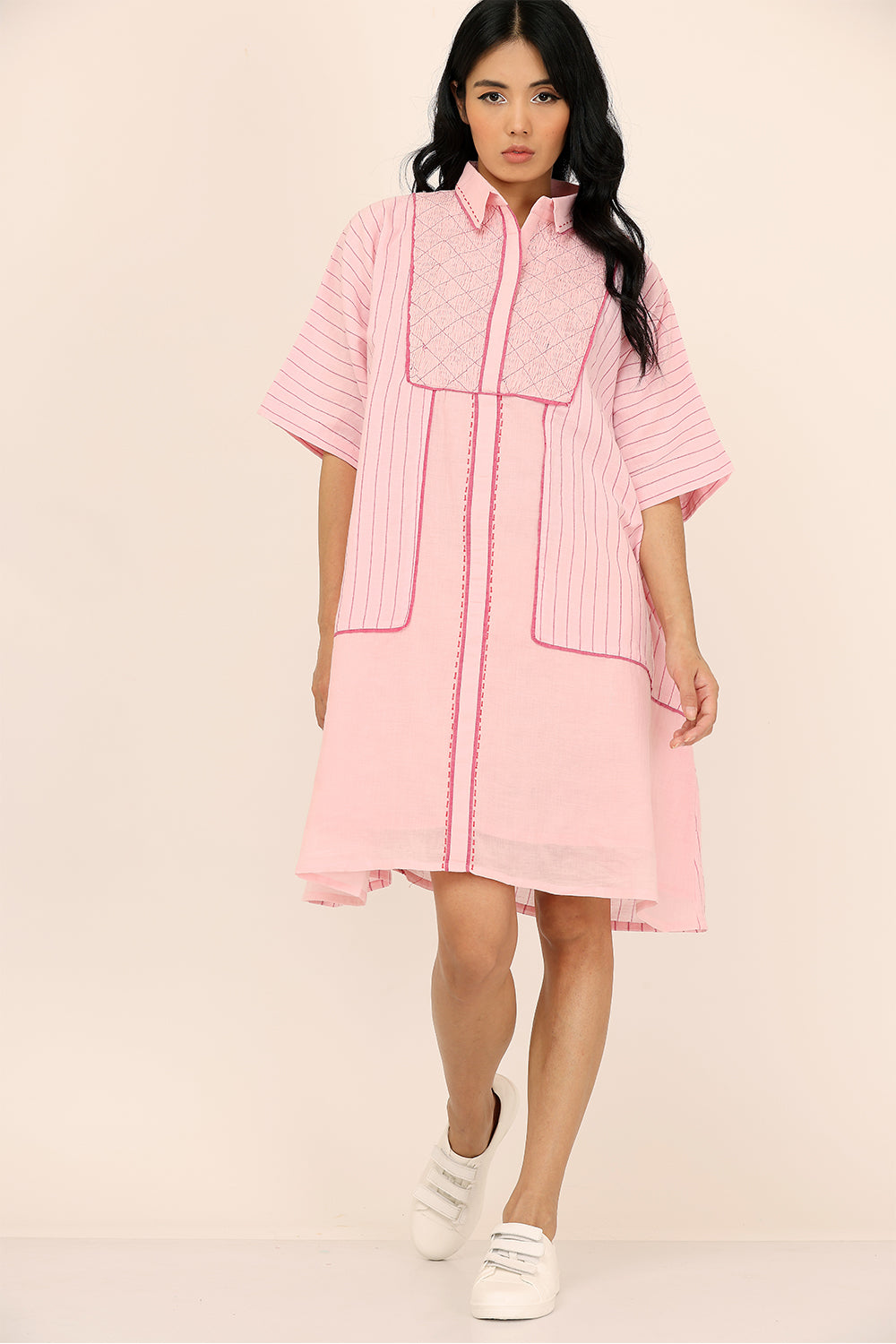 HAND SPUN JAMDHANI COTTON FABRIC \nIT HAS BEAUTIFUL BOBIN ELASTIC DETAILING ON YOK WHICH GIVES IT SMOCKEY LOOK. THIS IS FREE SIZE COMFORTABLE LOOSE FIT DRESS. \nCare Instruction:wash it with cold water