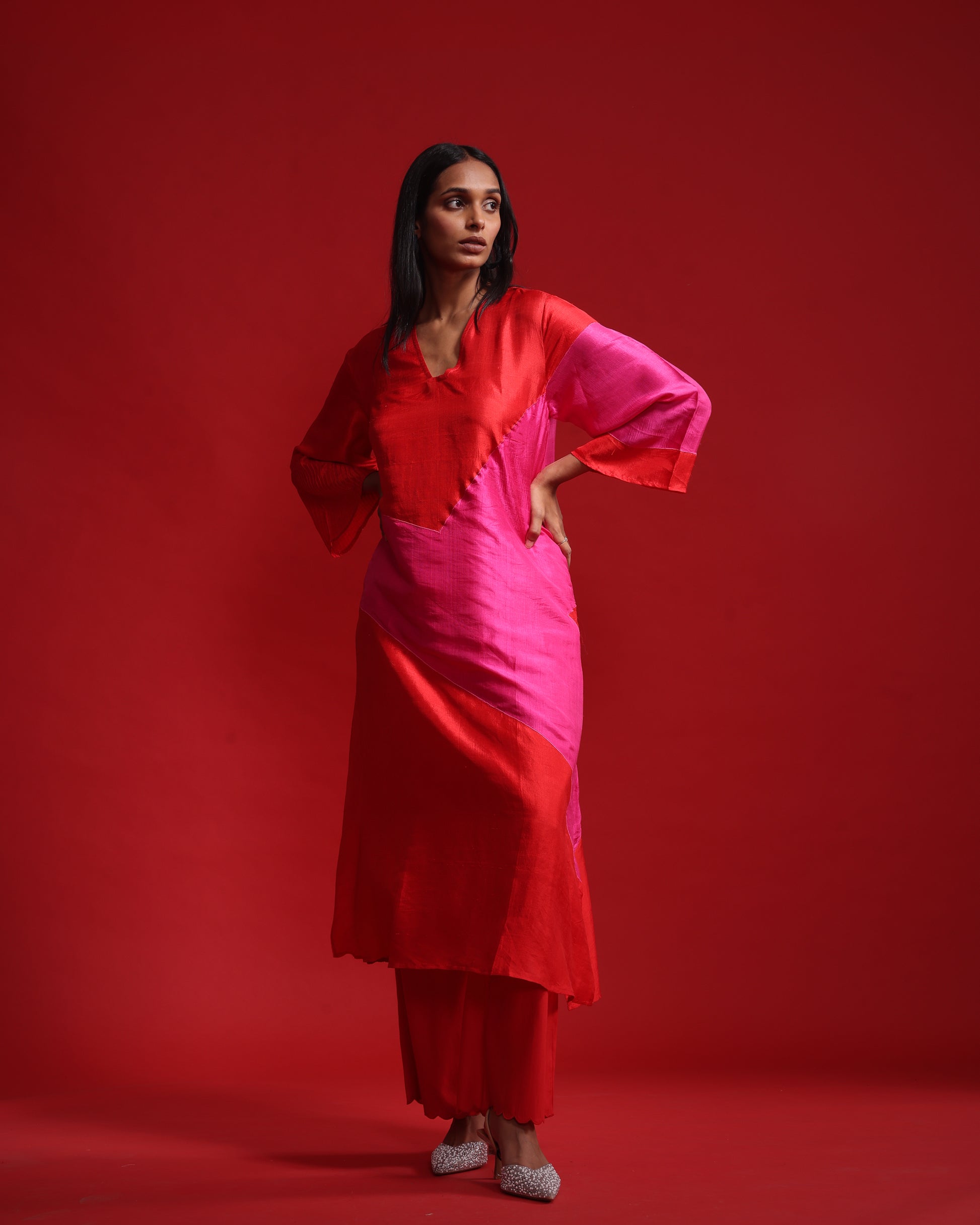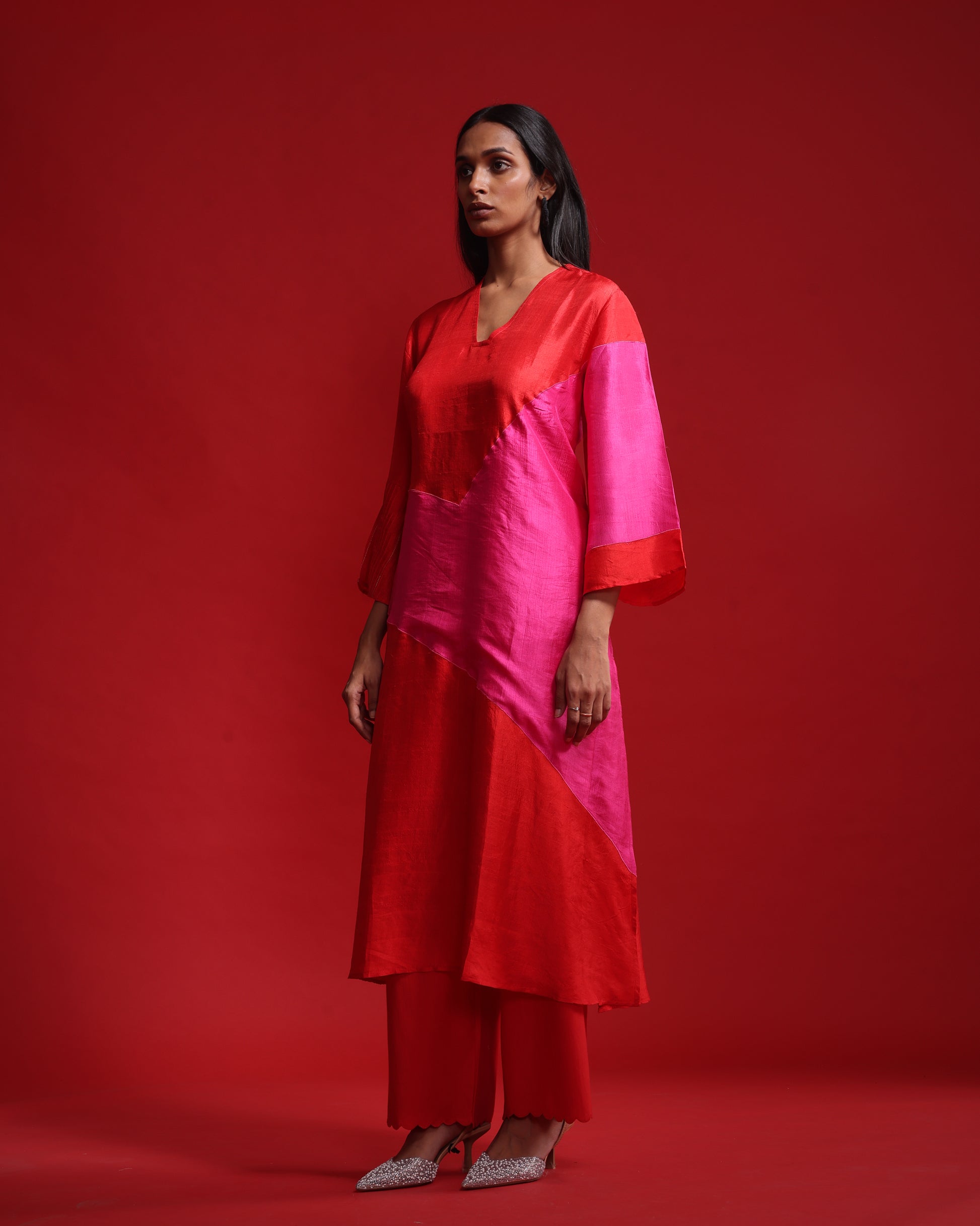 \nBEAUTIFUL COLOR BLOCK SHAPES ON KURTA . STRIGHT PANTS WITH SCALLOP EMBROIDERY.