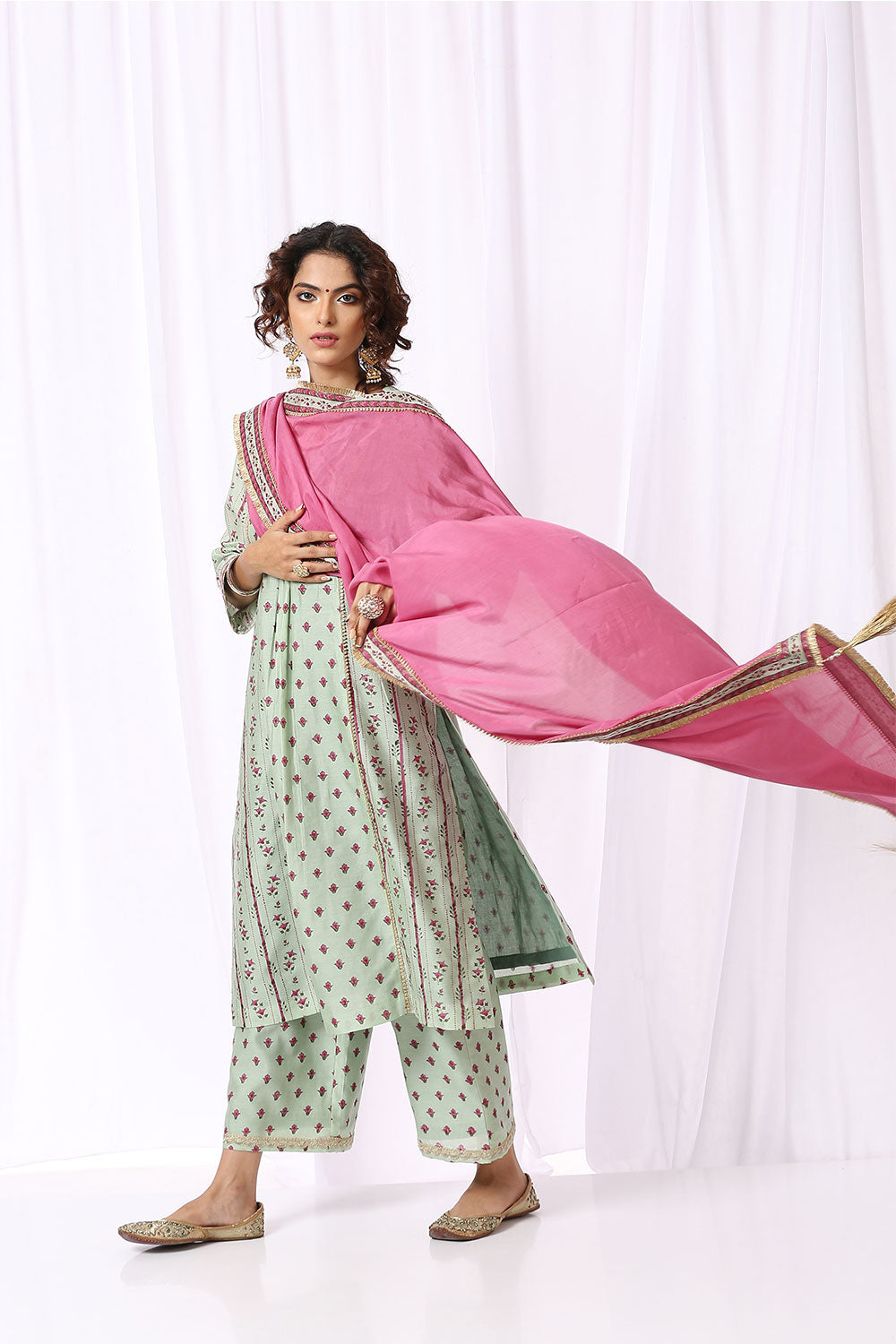 GREEN BASE CHANDERI HAND BLOCK PRINTED 'V' NECK KURTA SET OF -2