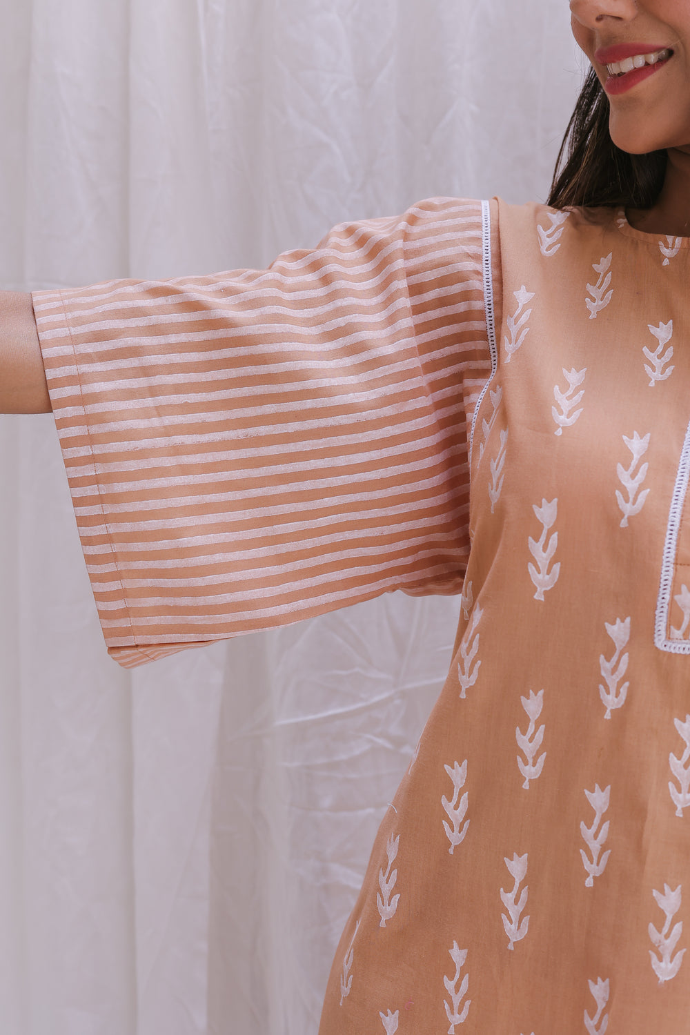 FINE CAMBRIC COTTON  FABRIC. /n BROAD STRIP SLEEVES,ARMHOLE WITH SMALL LAADDER CROCHET LACE DETAILING ,SAME DETALING ON KURTA BUTTON PATTI AND ON PANTS . /n Care Instruction:wash it with cold water \n