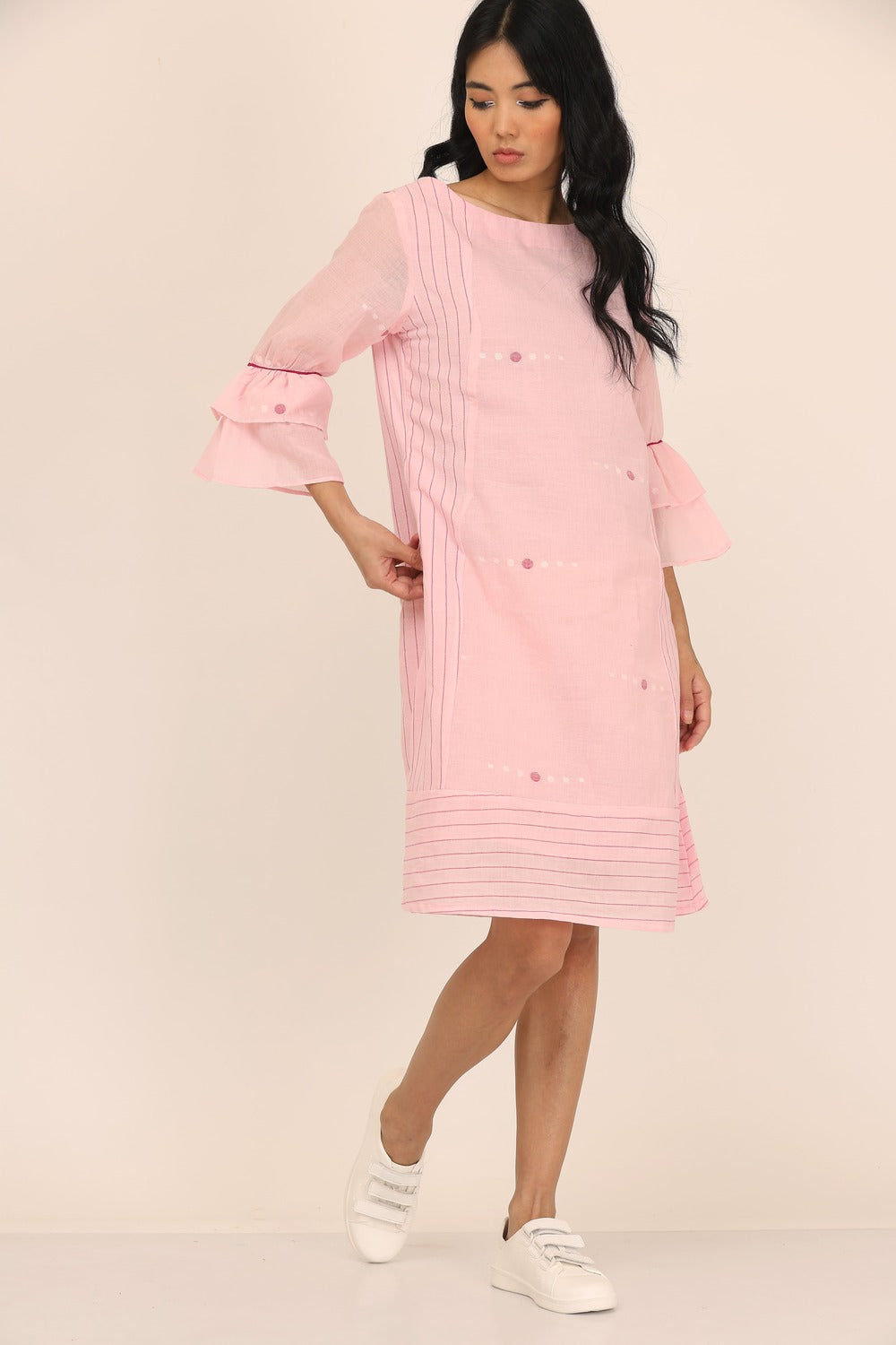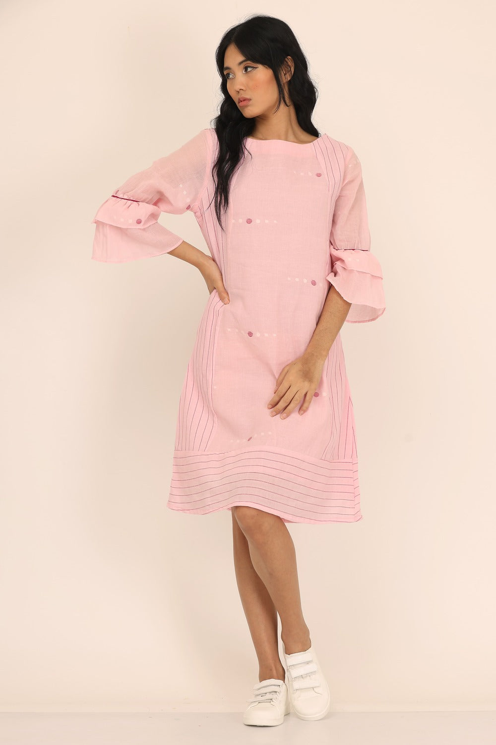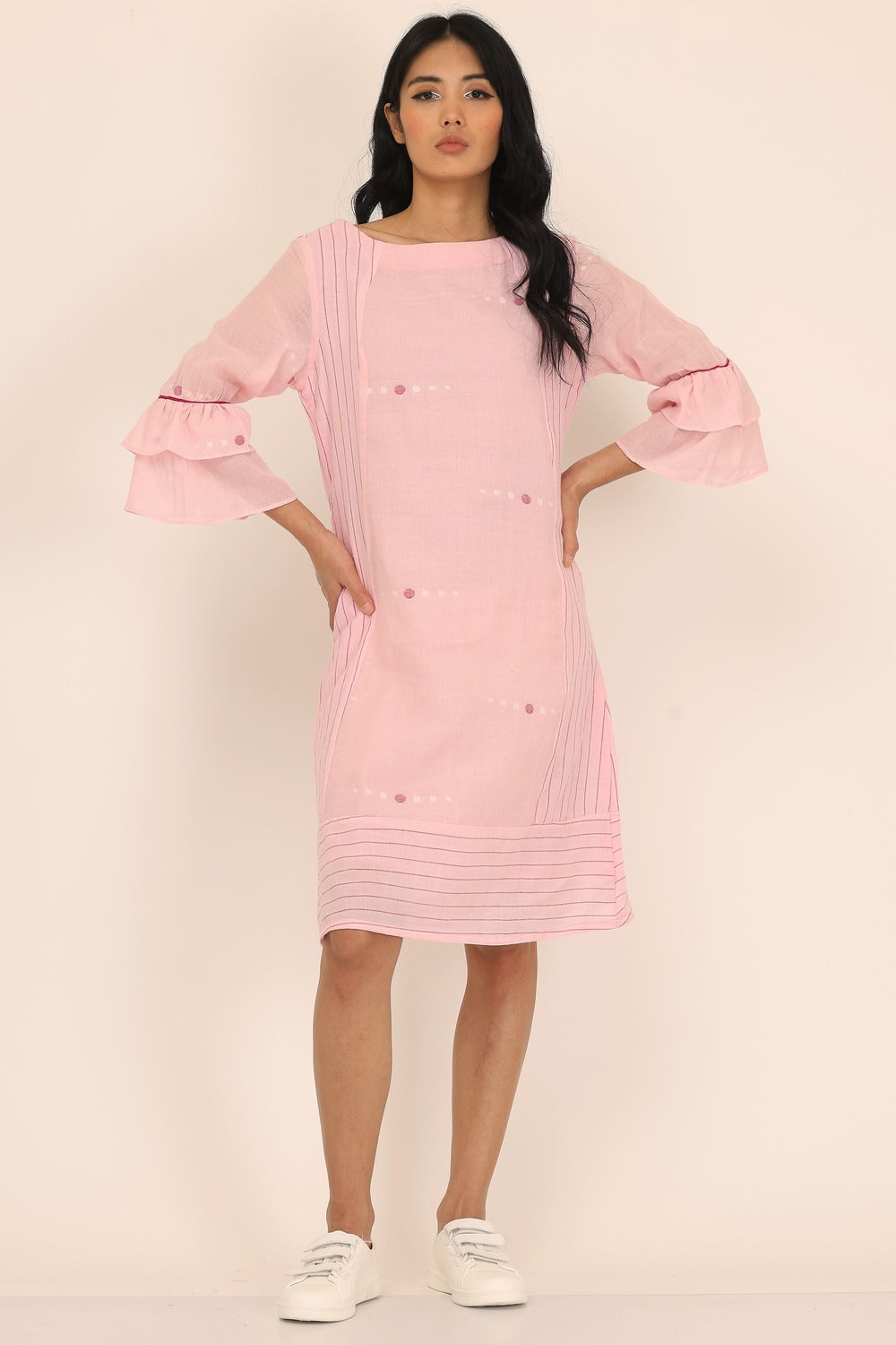 \nTHIS SHORT DRESS HAS DOUBLE LAYER FRILL SLEEVES DETAILING WITH BOAT NECK . IT HAS BOTH SIDE POCKET ALSO.