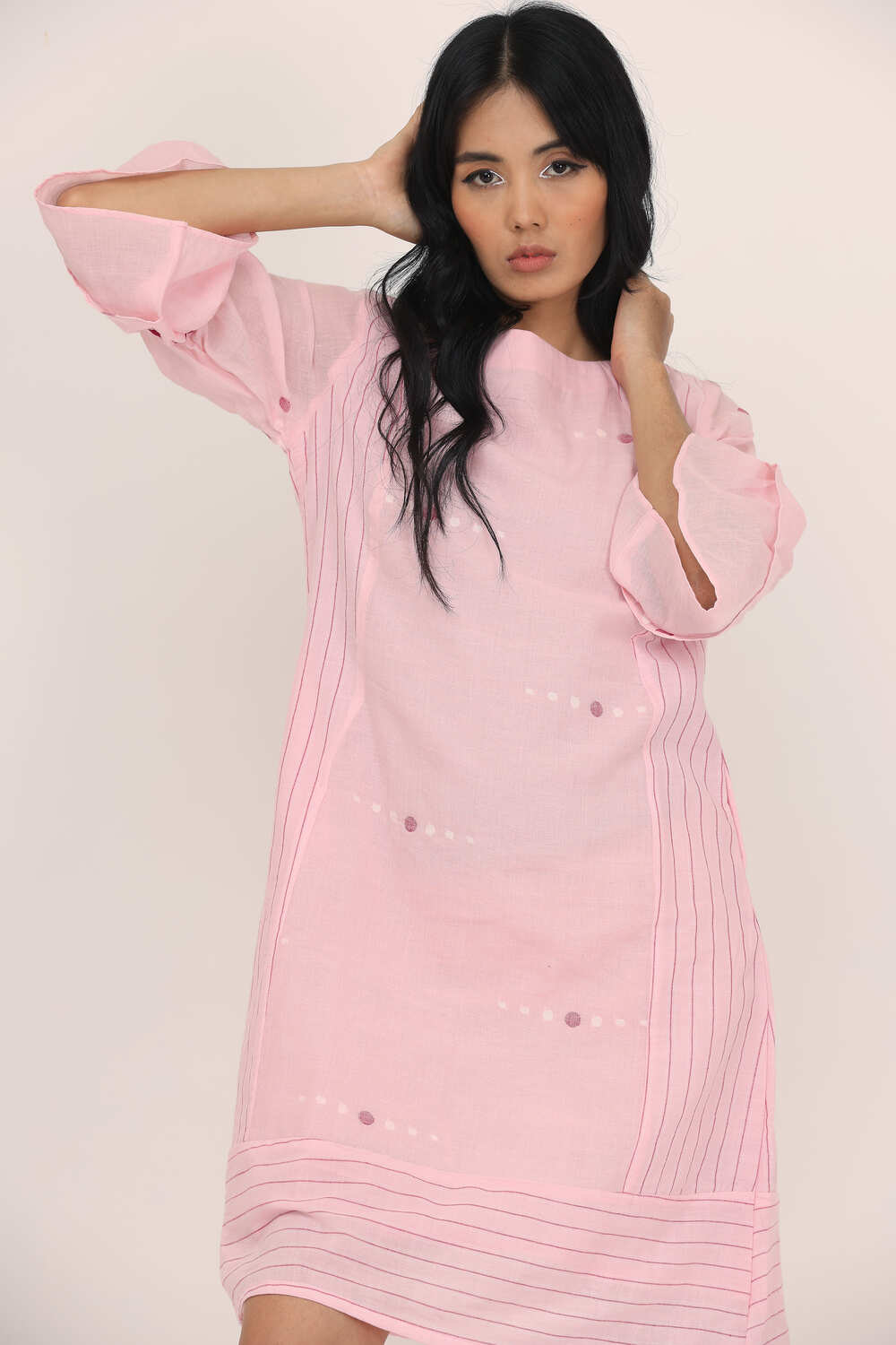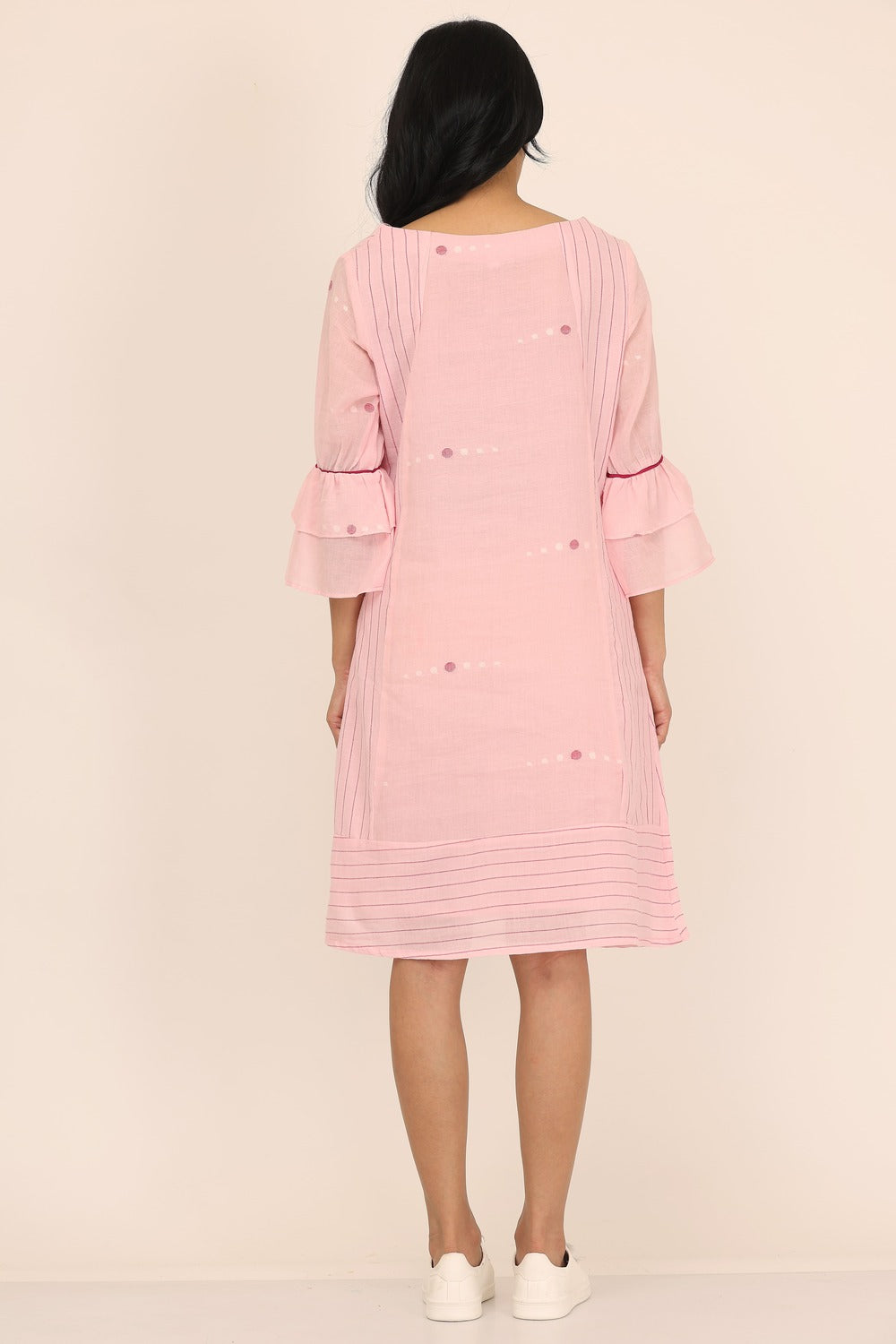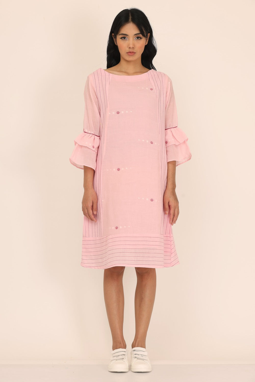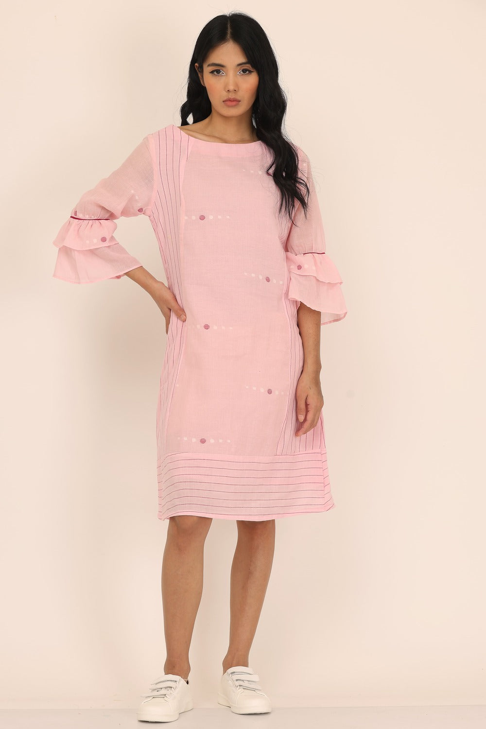 \nTHIS SHORT DRESS HAS DOUBLE LAYER FRILL SLEEVES DETAILING WITH BOAT NECK . IT HAS BOTH SIDE POCKET ALSO.