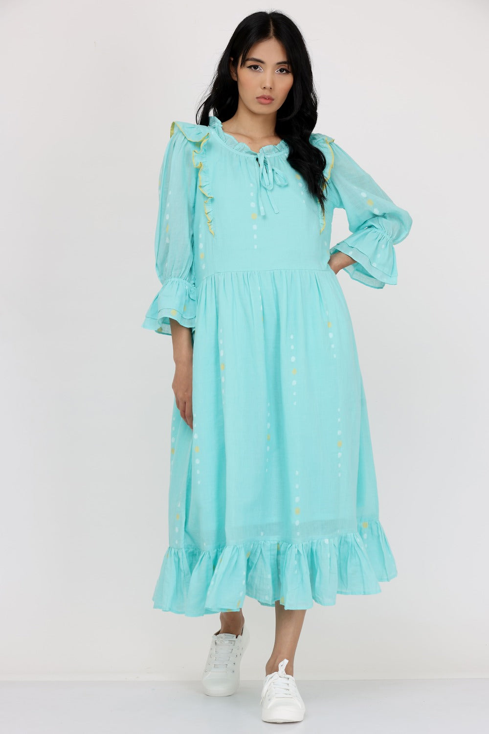 HAND SPUN JAMDHANI COTTON FABRIC \nFRILLS ON THE YOKE AND AT THE BOTTOM. AS WELL ON SLEEVES . \nCare Instruction:wash it with cold water