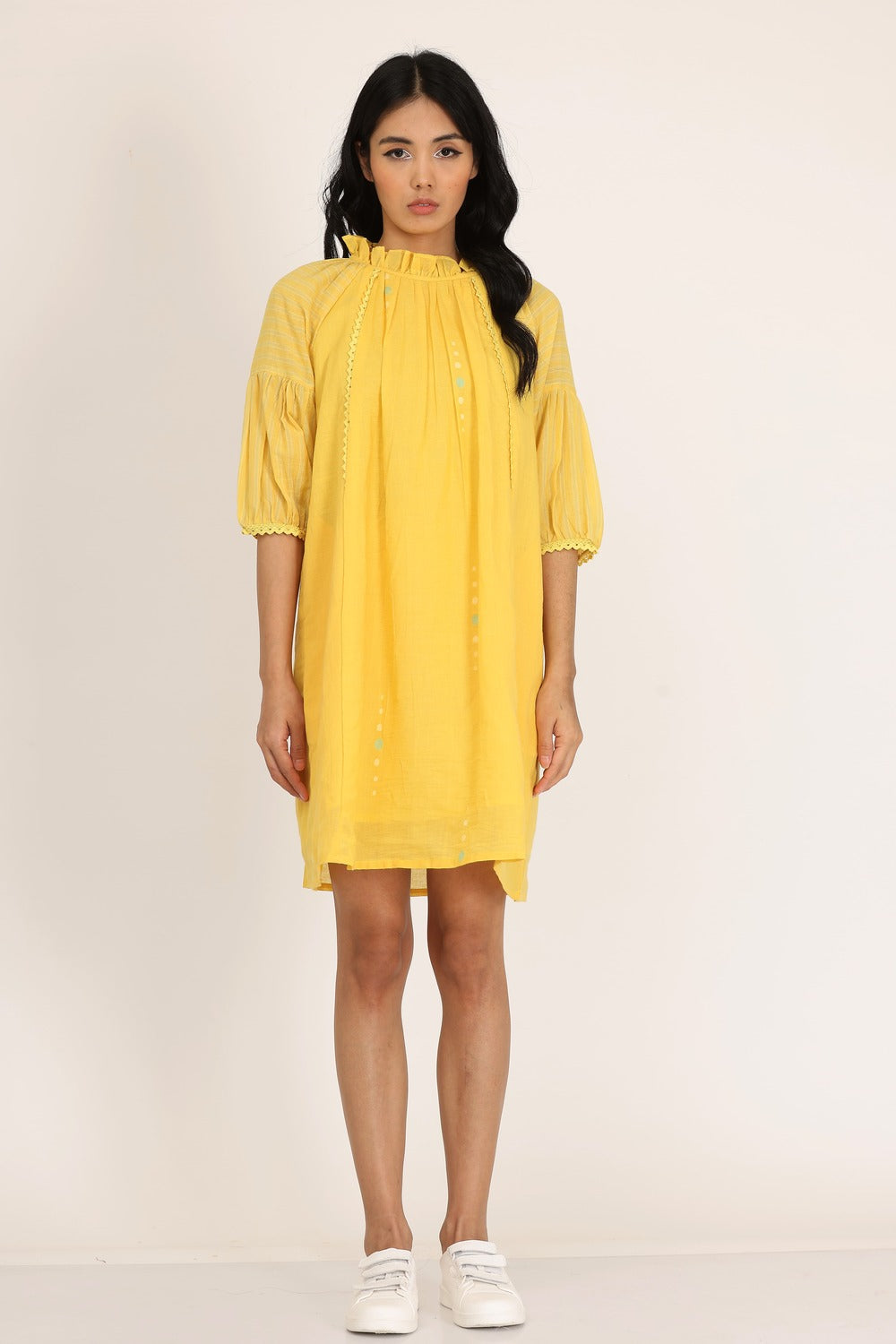 HAND SPUN JAMDHANI COTTON FABRIC \nSOFT FRILLS ON THE NECK WITH LACE DETAILING ON THE SLEEVES AND BODY \nCare Instruction:wash it with cold water