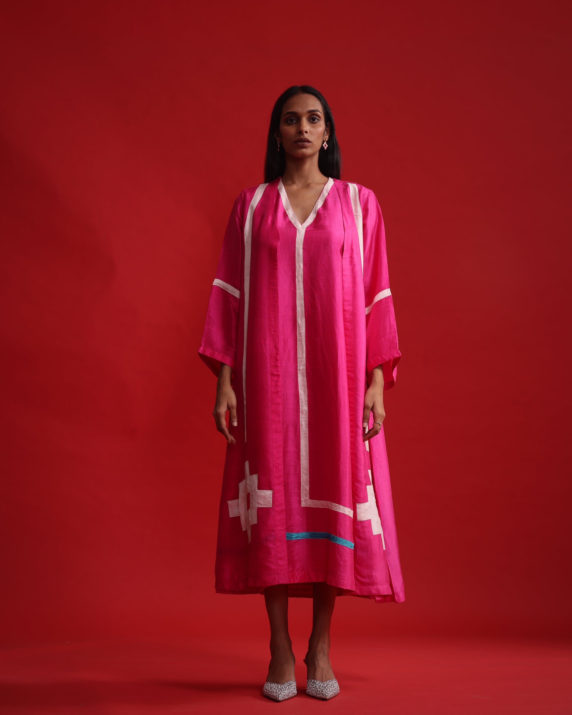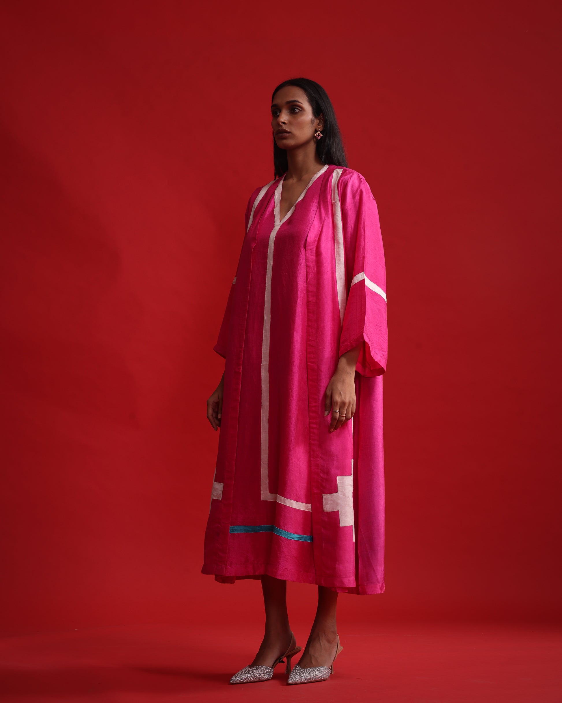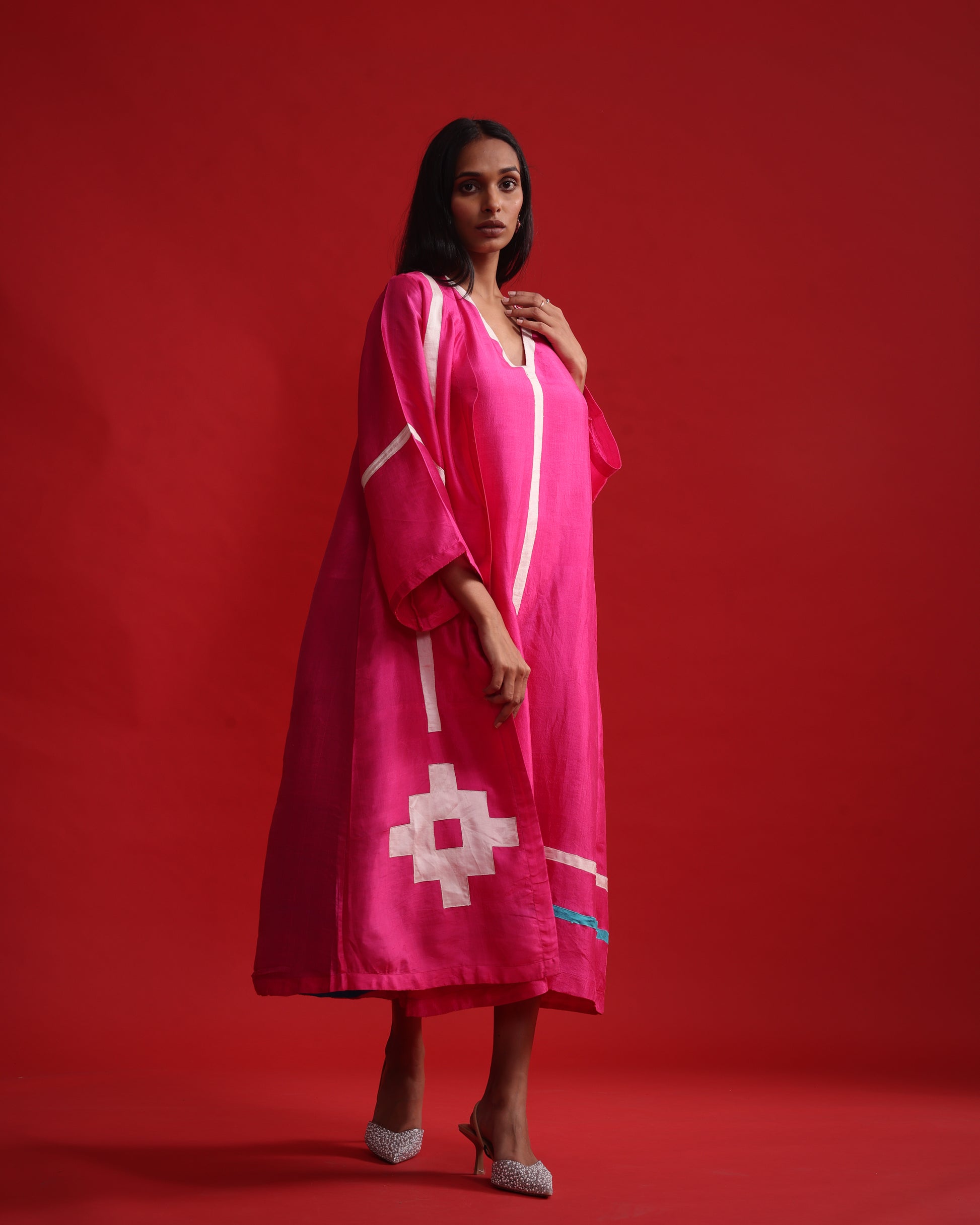 \nPINK JACKET DRESS WITH INNER . JACKET HAS BEAUTIFUL PATCH EMBROIDERY DESIGN AND GEOMETRICAL SHAPES.