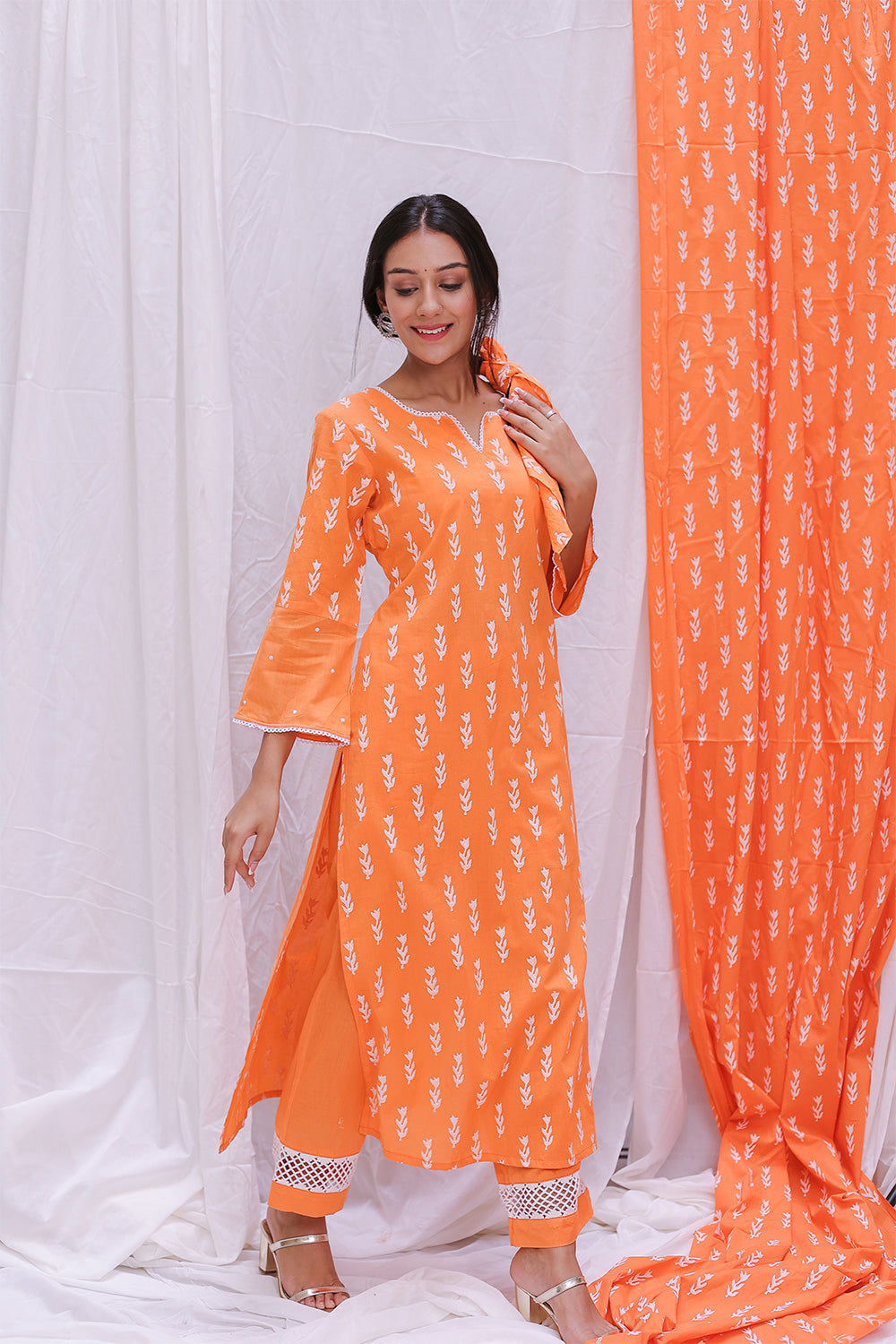 \nKURTA WITH NICE LACE DETALING ,SMALL -SMALL DOT OF WHITE THREAD EMBROIDERY ON SLEEVE EDGE AND PLAIN PANT ALSO WITH BROAD CROCHET WHITE LACE DETALING
