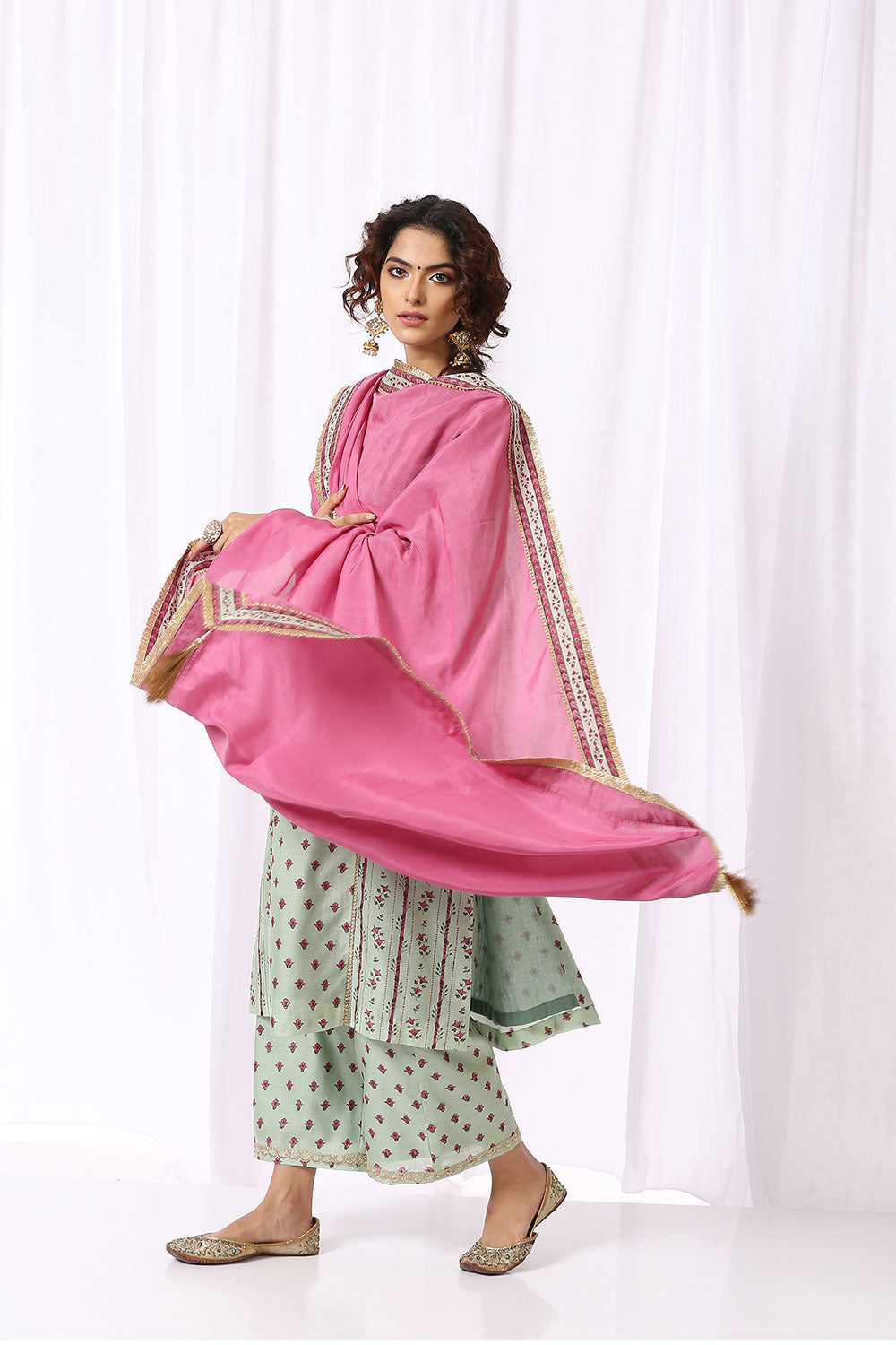 \nPINK BASE CHANDERI DUPTTA WITH PRINTED BORDERS AND BEAUTIFUL LACE DETAILING ON ALL FOUR SIDES OF DUPTTA WITH HAND MADE TASSELS.
