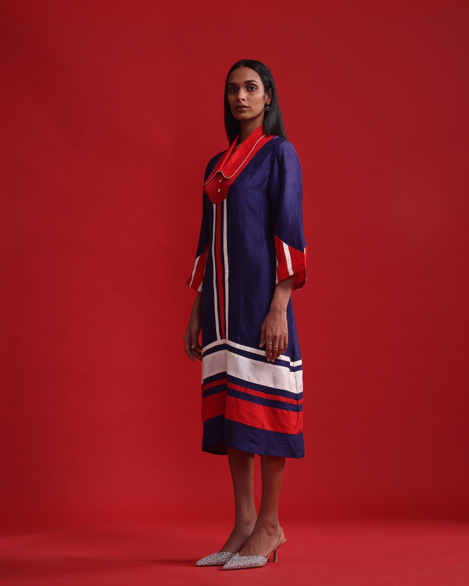 \nRED YOK WITH PINTUCKS DETAILING. AIRLINE DRESS WITH COLOR BLOCK PATCH EMBROIDERY.